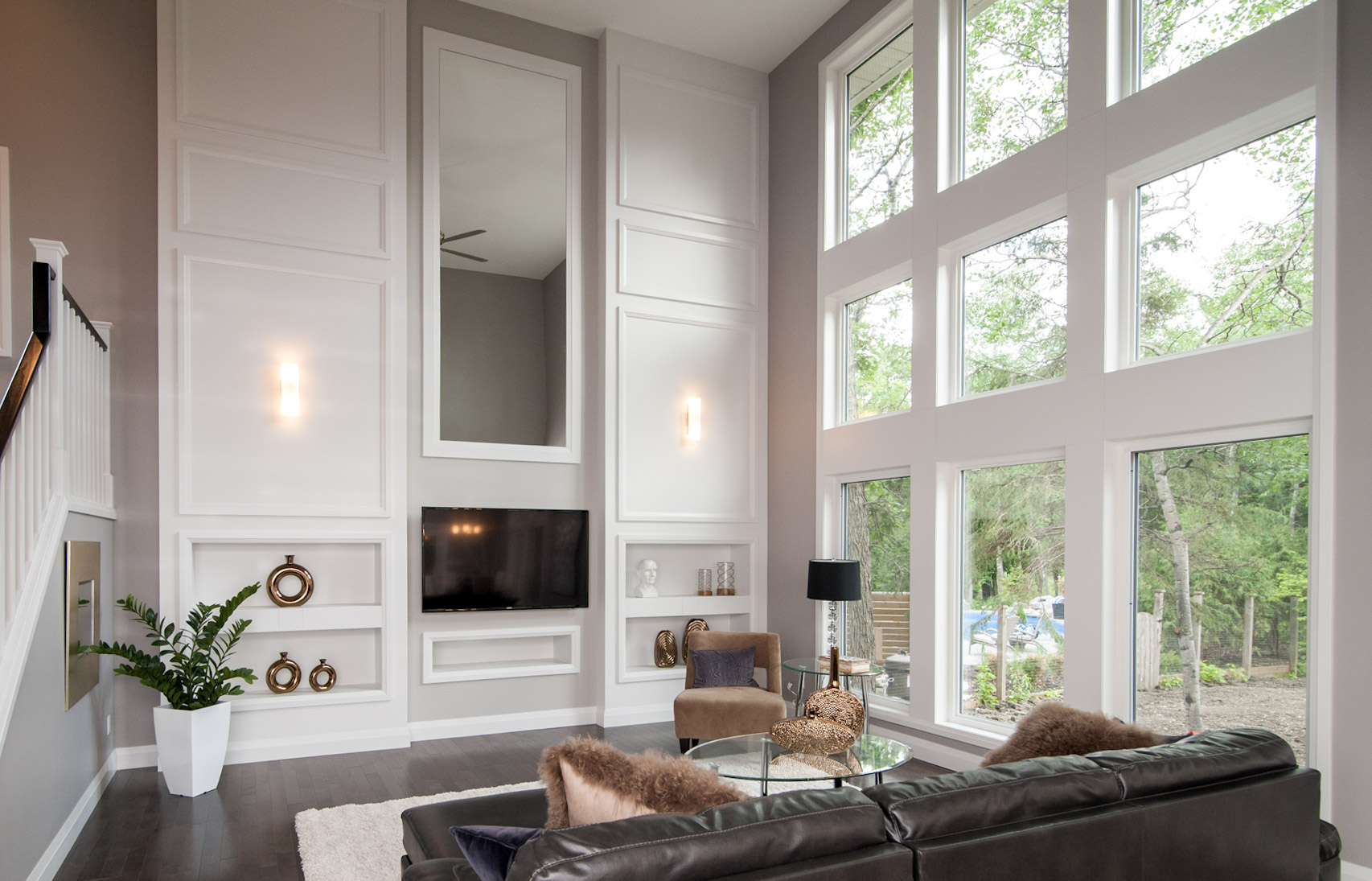 rowse the gallery to see how the Haney Custom Home integrates with its natural setting. The images highlight the striking floor-to-ceiling windows, the transitional style design, and the beautiful views of the Charleswood oaks. Each photo captures the elegance and functionality of the home, showcasing the successful blend of indoor and outdoor living.